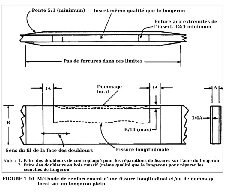 Les longerons fissurés (à l’exception des longerons caisson) peuvent être réparés par collage de plaques d’épicéa ou de contreplaqué d’épaisseur suffisante pour reprendre le cisaillement longitudinal des deux côtés du longeron. Prolonger les plaques bien au-delà de l’extrémité des fissures, comme indiqué à la figure 1-10. Une méthode de réparation de petits dommages locaux sur la face supérieure ou inférieure d’un longeron est également indiquée à la figure 1-10.